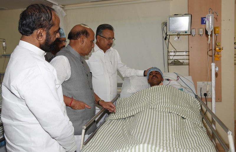 Before this Union Home Minister Rajnath Singh and Chief Minister of Chhattisgarh Dr. Raman Singh met the injured CRPF jawans at a private hospital on the Pachpadi Naka route here today and wished them to be well-advised. He reached the hospital with the Chief Minister Dr. Raman Singh and the Minister of State for Home, Mr. Hansraj Ahir and met the three CRPF jawans. It is known that these young people were wounded while fighting the Naxal attack in Sukma district yesterday. 25 CRPF martyrs were killed in the attack. The Union Home Minister arrived in Raipur this morning, where he paid tribute to the martyrs of the fourth battalion of Chhattisgarh Armed Forces with the Governor Mr. Balramji Das Tandon and Chief Minister Dr. Raman Singh. After this, they took the meeting of the officers in the fourth battalion and after meeting them, before meeting the injured jawans, they went to Pachpadi Naka to visit the injured jawans in private hospitals in Moova.