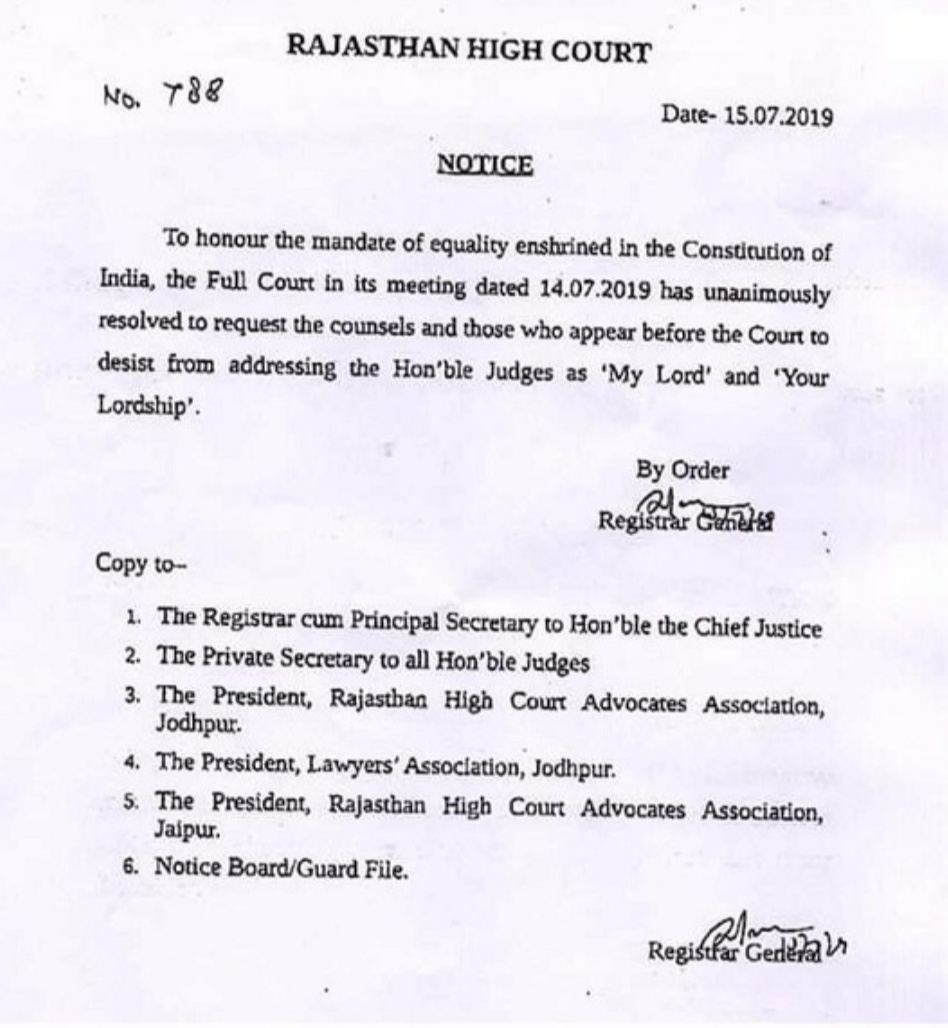 To honour the mandate of equality enshrined in the Construction of India, the full Court in its meeting dated 14.07.2019 has unanimously resolved to request the counsels and those who appear before the Court to desist from addressing the Hon’ble Judges as ‘My Lord’ and ‘Your Lordship’ .
