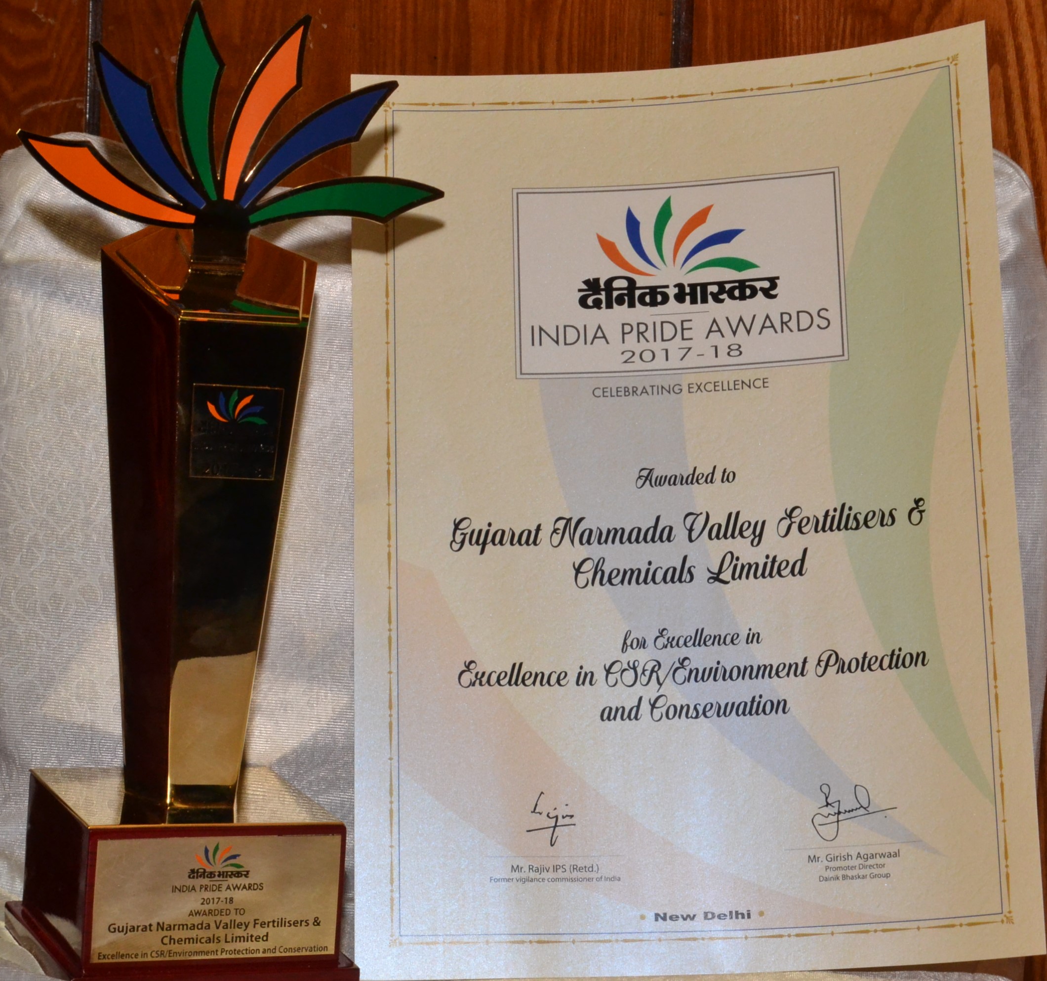 DB instituted ‘India Pride Awards’ as a tribute to honour and recognise the contributions made and excellence achieved in public services, especially by the Public Sector Undertakings (PSUs). The award is unique and one of its kind. The entries underwent a stringent selection process by the jury, which included Ms. Sumita Misra IAS, Joint Secretary (Prime Minister Economic Advisory Council),Balvinder Kumar IAS, Ex-Secretary (Ministry of Mines), Mohan Tiwari, Ex-CMD (IRCON), Dinesh K. Sarraf, Chairman (PNGRB) and Ex-CMD (ONGC), Dr. A K Manocha, Ex-CMD (IRCTC), etc. The award was supported by data and recommendations from Knowledge Partners “ICRA”. GNFC was selected as the winner for the outstanding practices displayed in its CSR activities.