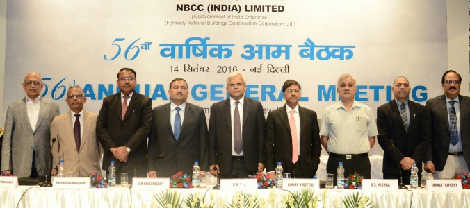 Sep 22nd, 2016 11:38 am | By ThenewsmanofIndia.com | Category: LATEST NEWSThe 56th Annual General Meeting (AGM) of NBCC, a Schedule ‘A’ Navratna CPSE under the Ministry of Urban Development, Govt. of India, and a State owned Construction Giant, was held in New Delhi recently. The AGM was chaired by CMD Dr. Anoop Kumar Mittal in presence of Board of Directors who informed the shareholders present about the financials and operating performance of NBCC during the last fiscal 2015-16. Dr. Mittal stated that the Company, during 2015-16, registered 32% growth in topline as compared to previous year, posted a profit of Rs 311 Crore while its total income surged to Rs 5838 Crore and PAT from Rs.278 Crores to Rs.311 Crore. He also informed that NBCC’s outstanding Order Book stood at Rs.70000 Crores and counting. With these improved Financial Results, Company has recommended 100% dividend for the FY 2015-16.