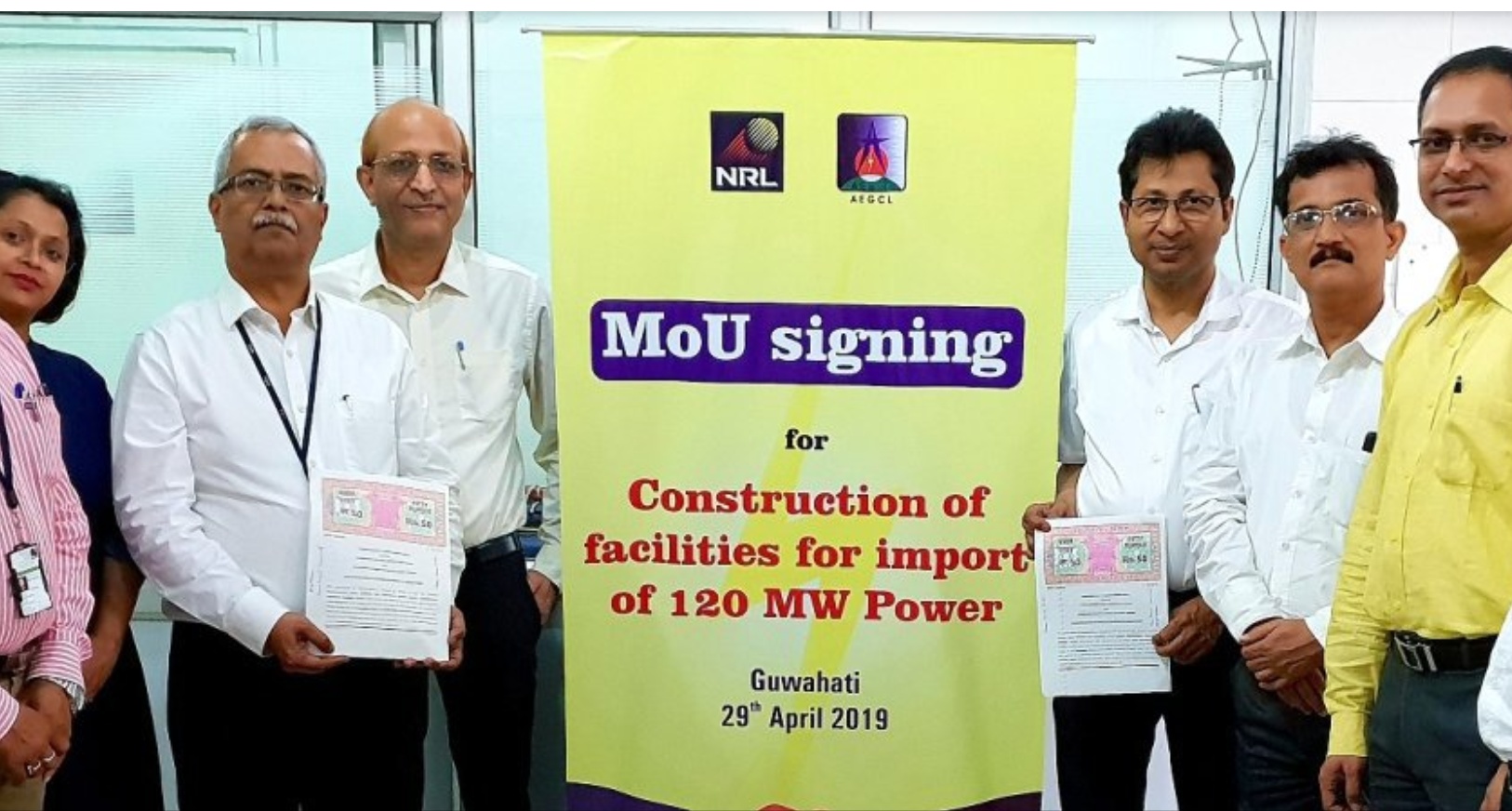 Numaligarh Refinery Limited (NRL) signed an MOU with Assam Electricity Grid Corporation Limited (AEGCL) for construction of facilities for importing of 120 MW Power from 220 KV Grid owned by AEGCL. The MoU was signed between CGM (Project) NRL, A P Chakraborty and CGM AEGCL -P K Medhi in Guwahati on 29-04-19 in the presence of CGM (Tech) NRL Mr. N Borthakur and other senior officials from both the organizations.
