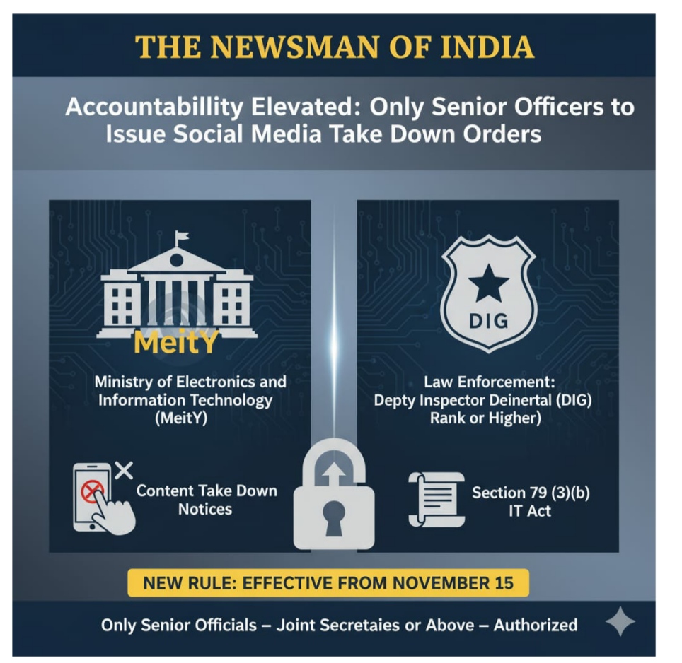 By THE NEWSMAN OF INDIA| Accountability Elevated: Only Senior Officers to Issue Social Media Take Down Orders. In a major policy shift aimed at enhancing accountability and transparency in the digital ecosystem, the Ministry of Electronics and Information Technology (MeitY) has announced that only senior officials — Joint Secretaries or above, and in law enforcement, officers at the rank of Deputy Inspector General (DIG) or higher — will be authorized to issue content take down notices under Section 79 (3)(b) of the Information Technology Act. The new rule will come into effect from November 15.