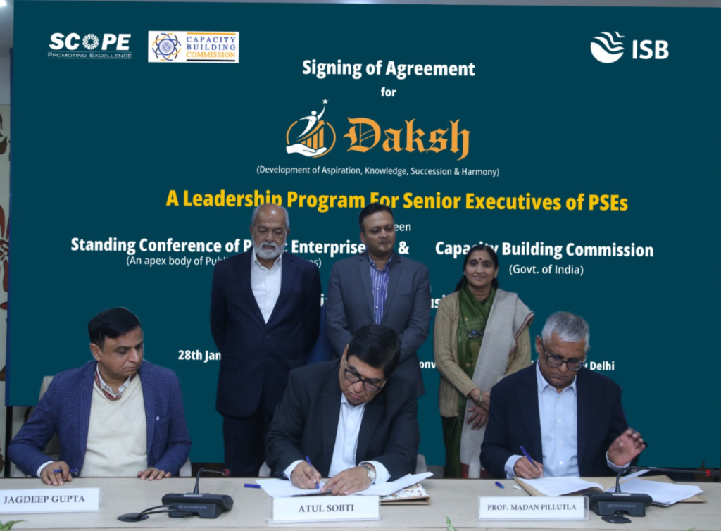 By THE NEWSMAN OF INDIA.COM| 28th January 2026 |Pivoting future leadership through DAKSH leadership program, Standing Conference of Public Enterprises (SCOPE) and Capacity Building Commission (CBC), GoI signed an agreement with the Indian School of Business (ISB) for the third batch. Atul Sobti, Director General, SCOPE, Jagdish Gupta, Joint Secretary, CBC, and Professor Madan Pillutla, Dean, Indian School of Business (ISB) signed the agreement in the presence of Dr. Alka Mittal, Member, CBC; Adil Zainulbhai, Former Chairman, CBC; officials from CBC, SCOPE and ISB.